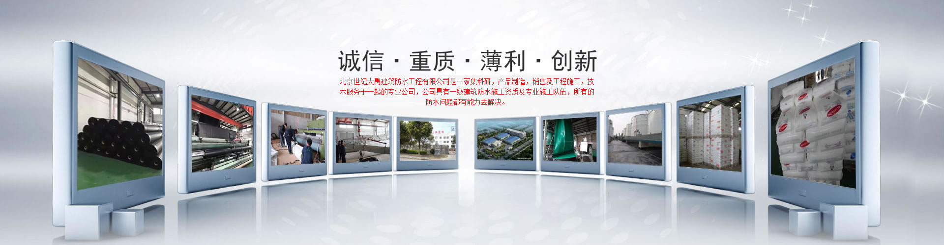 北京世紀(jì)大禹建筑防水工程有限公司是一家集科研,產(chǎn)品制造,銷售及工程施工,技術(shù)服務(wù)于一起的專業(yè)公司,產(chǎn)品主要包括道路橋梁專用材料、建筑堵漏材料、建筑防水卷材、建筑防水涂料等。產(chǎn)品行銷全國,形成了覆蓋全國的營銷服務(wù)網(wǎng)絡(luò)。產(chǎn)品廣泛應(yīng)用于建筑物屋面、地下、地鐵、隧道、橋梁、泳池、糧庫、種植屋面等防水、防潮、防腐、防滲等工程。公司具有一級建筑防水施工資質(zhì)及專業(yè)施工隊(duì)伍,所有的防水問題都有能力去解決,作為系統(tǒng)防水解決方案的提供者,我們已經(jīng)將各項(xiàng)防水系統(tǒng)成功應(yīng)用于國家大型基礎(chǔ)設(shè)施建設(shè)項(xiàng)目中,防水系統(tǒng)優(yōu)良的應(yīng)用效果也獲得了用戶及社會各界的高度評價。 用戶滿意是企業(yè)永恒的追求,在充滿機(jī)遇挑戰(zhàn)的時期,將以市場為導(dǎo)向,以人才為根本,以技術(shù)為支撐,以資本為紐帶,打造一個實(shí)力雄厚、核心競爭力強(qiáng)大的國際化企業(yè)。我們將用信念、追求和執(zhí)著開啟新的航程,乘風(fēng)破浪,勇往直前,駛向我們的理想和目標(biāo),為人類及社會創(chuàng)造持久安全的環(huán)境及構(gòu)筑和諧的人居環(huán)境貢獻(xiàn)我們的力量! |